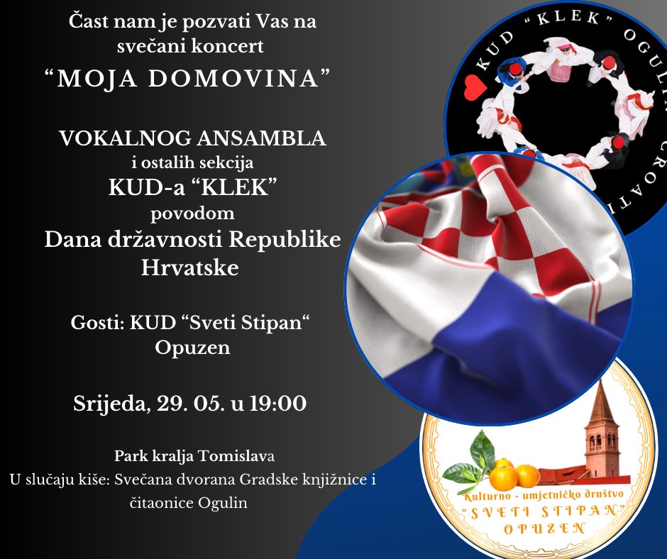 Kulturno-umjetničko društvo (KUD) “Klek” iz Ogulina sa zadovoljstvom poziva sve građane na svečani koncert pod nazivom “Moja domovina”, koji će se održati povodom Dana državnosti Republike Hrvatske. Ovaj posebni događaj zakazan je za srijedu, 29. svibnja, s početkom u 19:00 sati, u prekrasnom ambijentu Parka kralja Tomislava.