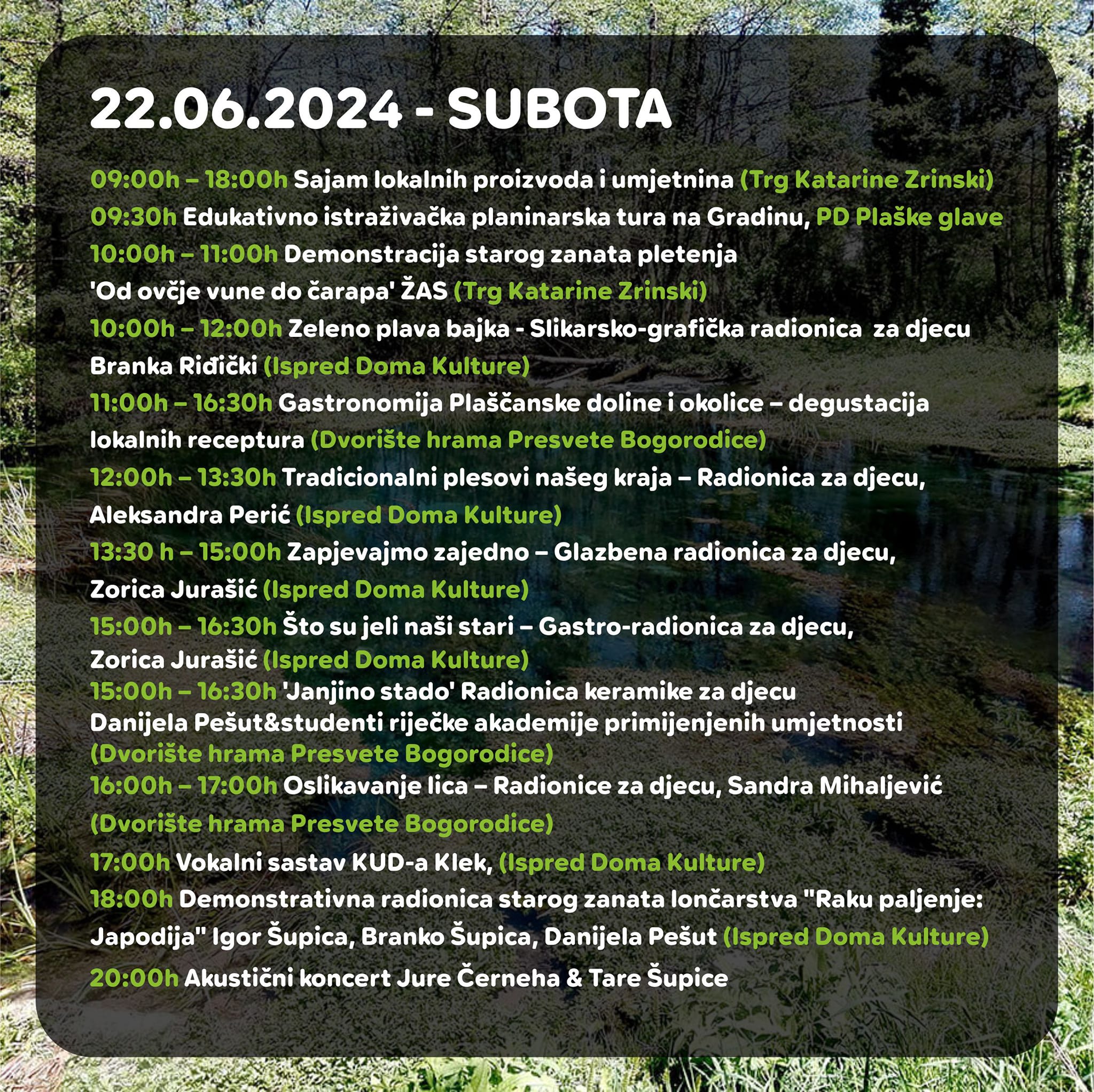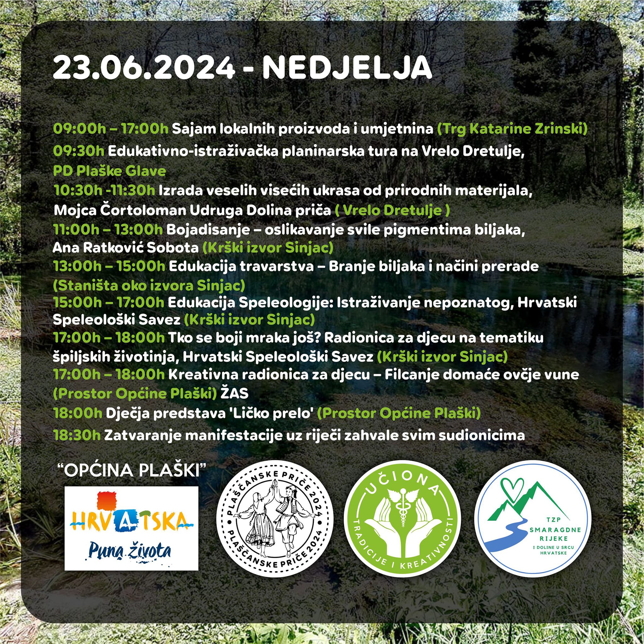 Općina Plaški poziva sve građane na trodnevnu manifestaciju “Plaščanske Priče 2024.”, koja će se održati od 21. do 23. lipnja 2024. godine. Ova kulturno-prirodna manifestacija obuhvatit će niz zanimljivih i edukativnih sadržaja za djecu, mlade i odrasle na nekoliko lokacija u Plaščanskoj dolini.