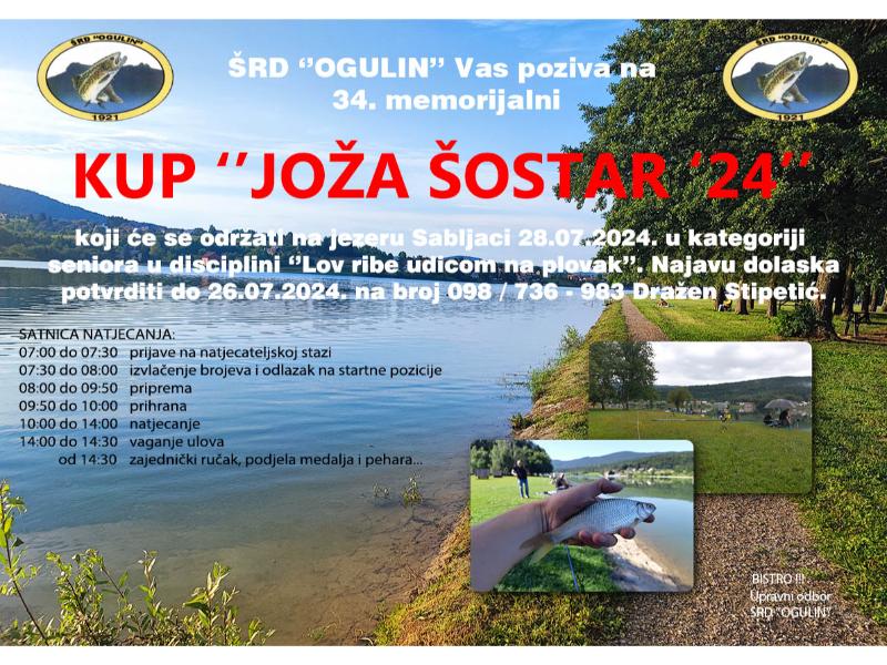 Športsko ribolovno društvo “Ogulin” najavljuje 34. memorijalni kup “Joža Šostar”, koji će se održati 28. srpnja 2024. godine na jezeru Sabljaci. Ovaj događaj okuplja ribolovce u disciplini “Lov ribe udicom na plovak”, a natjecanje će se odvijati u kategoriji seniora.