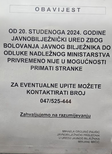 Prema Zakonu o javnom bilježništvu tj. protekom vremena od 30 dana od odlaska na bolovanje gđe. Mirjane Brčić, javne bilježnice u Ogulinu, Grad Ogulin privremeno je ostao bez usluga javnog bilježnika. Time postaje upitan opstanak i nastavak rada javnog bilježnika u Ogulinu pa je iz spomenutog razloga saborska zastupnica Anđelka Salopek urgentno kontaktirala ministra pravosuđa, uprave i digitalne transformacije gdina. Damira Habijana da pokuša riješiti nastali problem donošenjem odluke o imenovanju zamjenika javnog bilježnika. Na taj način osigurat će se nesmetani nastavak rada ureda. Zamjena može obavljati bilježničke dužnosti i poslove koji su obuhvaćeni djelatnostima ureda. Ako zamjena nije dostupna, ured bi mogao obustaviti rad dok bilježnica ne povrati zdravlje ili dok ne bude imenovana zamjena. Ovim činom izbjegla se potreba odlaska u najbliže urede javnog bilježnika u Dugu Resu ili Karlovac. To bi iziskivalo daleko veće troškove za sve građane i brojne pravne osobe, a i vremenski bi se odužili npr. ostavinski postupci, osnivanja trgovačkih društava i slično. Isto tako bi se sačuvala i radna mjesta više zaposlenih. Ministar Habijan je obećao preko državnog tajnika brzo rješenje ovog problema.