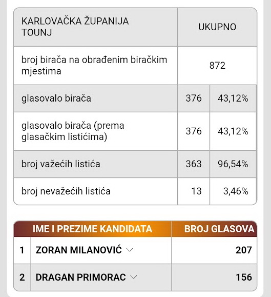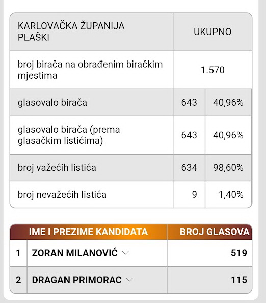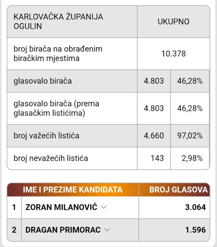 Zoran Milanović je premoćno pobijedio u Karlovačkoj županiji sa 31 457 glasova naspram 13 755 glasova za Dragana Primorca. U Ogulinu je Milanović dobio 3 064 glasa a Primorac 1596. Od ostalih lokalnih samouprava bivše općine Ogulin Milanović je pobijedio u Josipdolu, Tounju i Plaškom a Primorac u Saborskom. Jedinu pobjedu uz Saborsko, Primorac je još ostvario u Cetingradu.