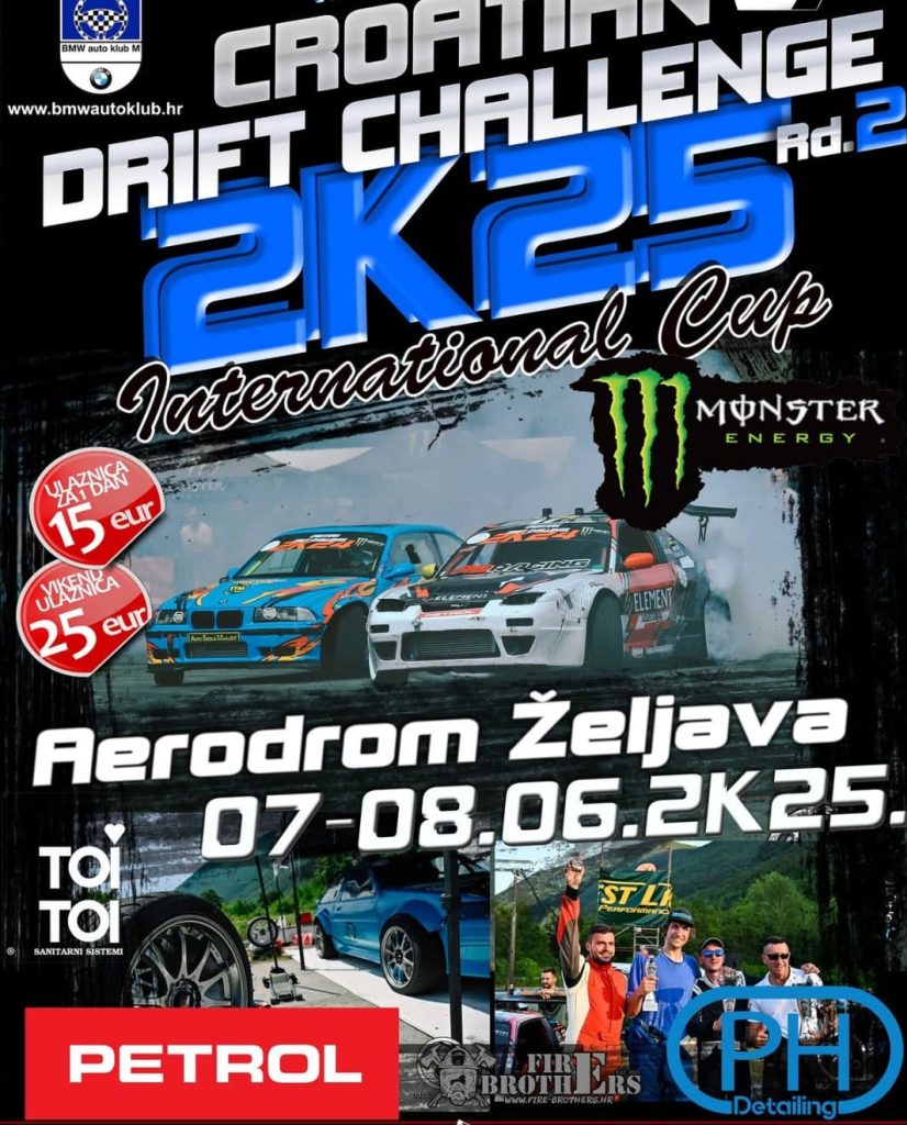 Na legendarnoj pisti bivšeg vojnog aerodroma Željava 7. i 8. lipnja održat će se drugi krug natjecanja Croatian Drift Challenge 2K25 – International Cup, jednog od najatraktivnijih automobilskih događaja u regiji. U organizaciji BMW Auto Kluba M i pod pokroviteljstvom Monster Energyja, ovaj drift spektakl okuplja vrhunske vozače iz Hrvatske i inozemstva.