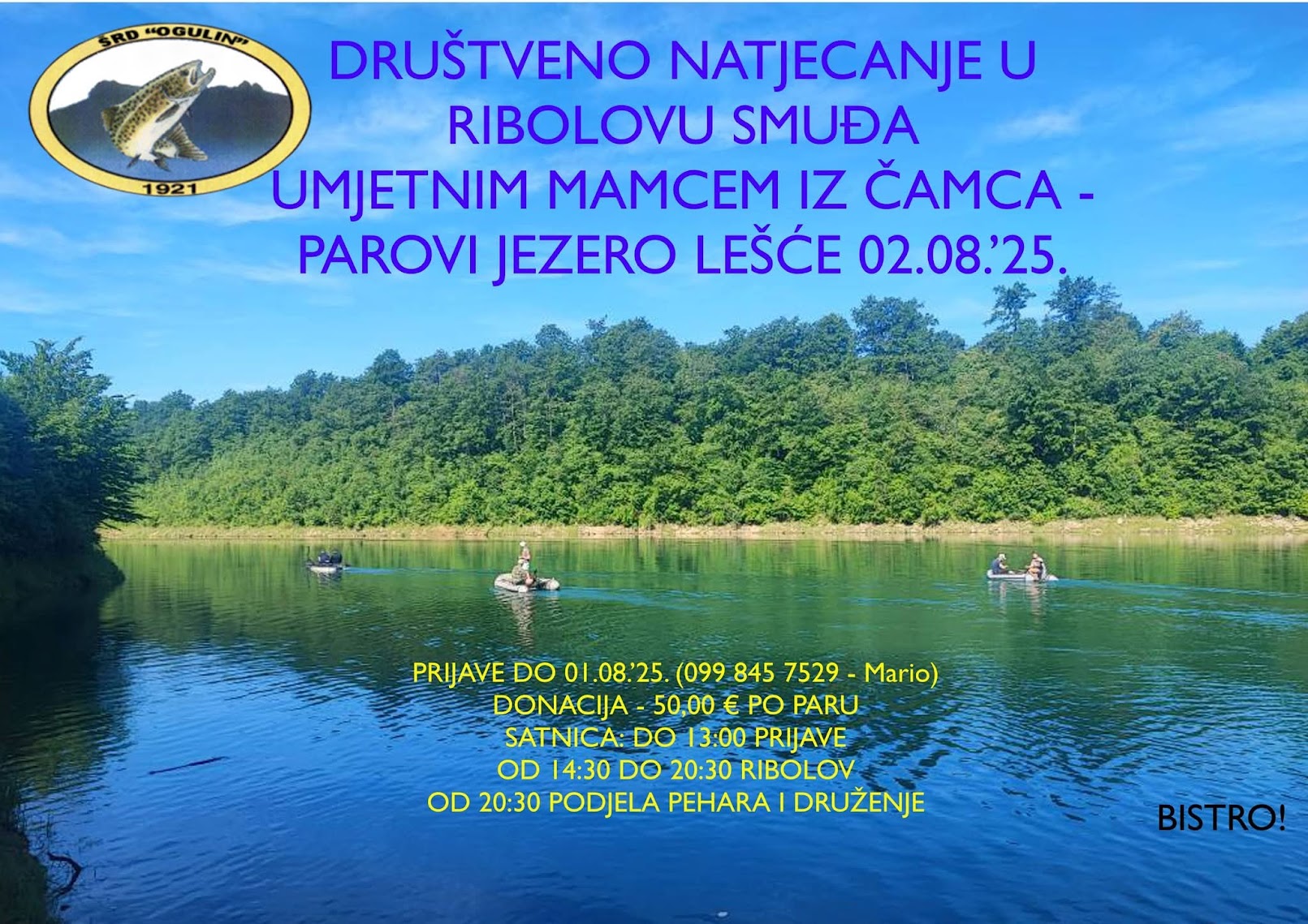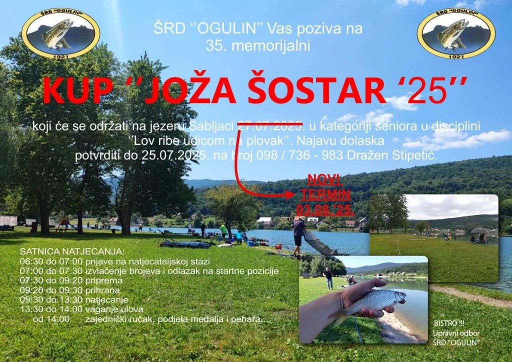 Nastupajućeg vikenda Športsko ribolovno društvo ima značajne aktivnosti. U subotu je na jezeru Lešće (akumulacija HE Lešće kod Trošmarije) na rasporedu Društveno natjecanje u ribolovu smuđa umjetnim mamcem iz čamca u parovima. U nedjelju je središnji godišnji sportski događaj ŠRD Ogulina, a to je jubilarni 35. Kup Jože Šostara u lovu ribe udicom na plovak koji se održava na jezeru Sabljacima. Kuop se je trebao održati 25. srpnja, no zbog lošeg vremena prebačen je za nedjelju 3. kolovoza.