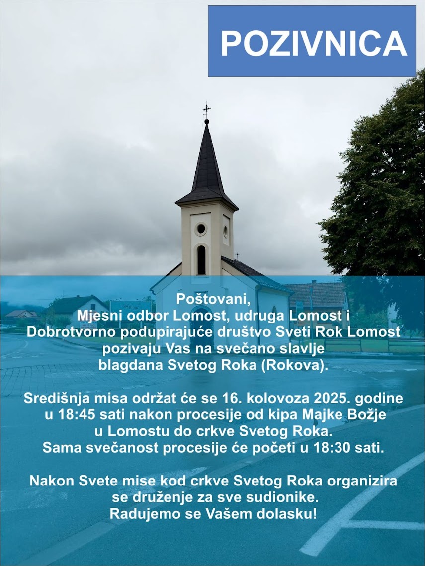 Nakon Velike Gospe slijedi za Ogulince a posebno Lomošćane važan blagdan, Rokova u subotu 16. kolovoza. I ove godine proslava će početi kod kipa Majke Božje uz procesiju do crkve sv. Roka gdje će biti misa pored crkve. Nakon mise slijedi druženje nazočnih hodočasnika i dobronamjernika. Iako se od pamtivijeka spominjala narodna mudra izreka “sveti Rok iz vode skok” izgleda da klimatske promjene sve mijenjaju, pa se sezona kupanja u našim jezerima i vodotocima produžava i u rujnu.