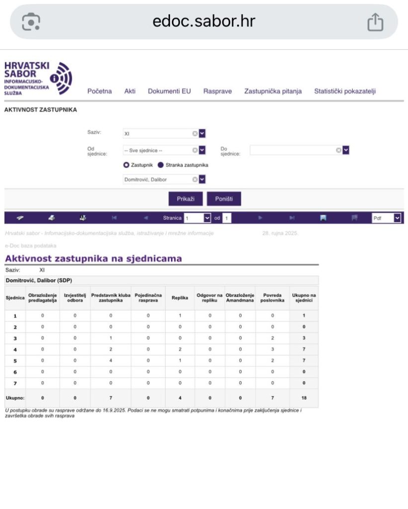 Analiza aktivnosti pokazuje značajne razlike među zastupnicima. Domitrović je do kraja rujna 2025. zabilježio ukupno 18 saborskih aktivnosti, među kojima su povrede Poslovnika, replike i nastupi kao izvjestitelj odbora. Najveća aktivnost zabilježena je tijekom 3. i 6. sjednice.