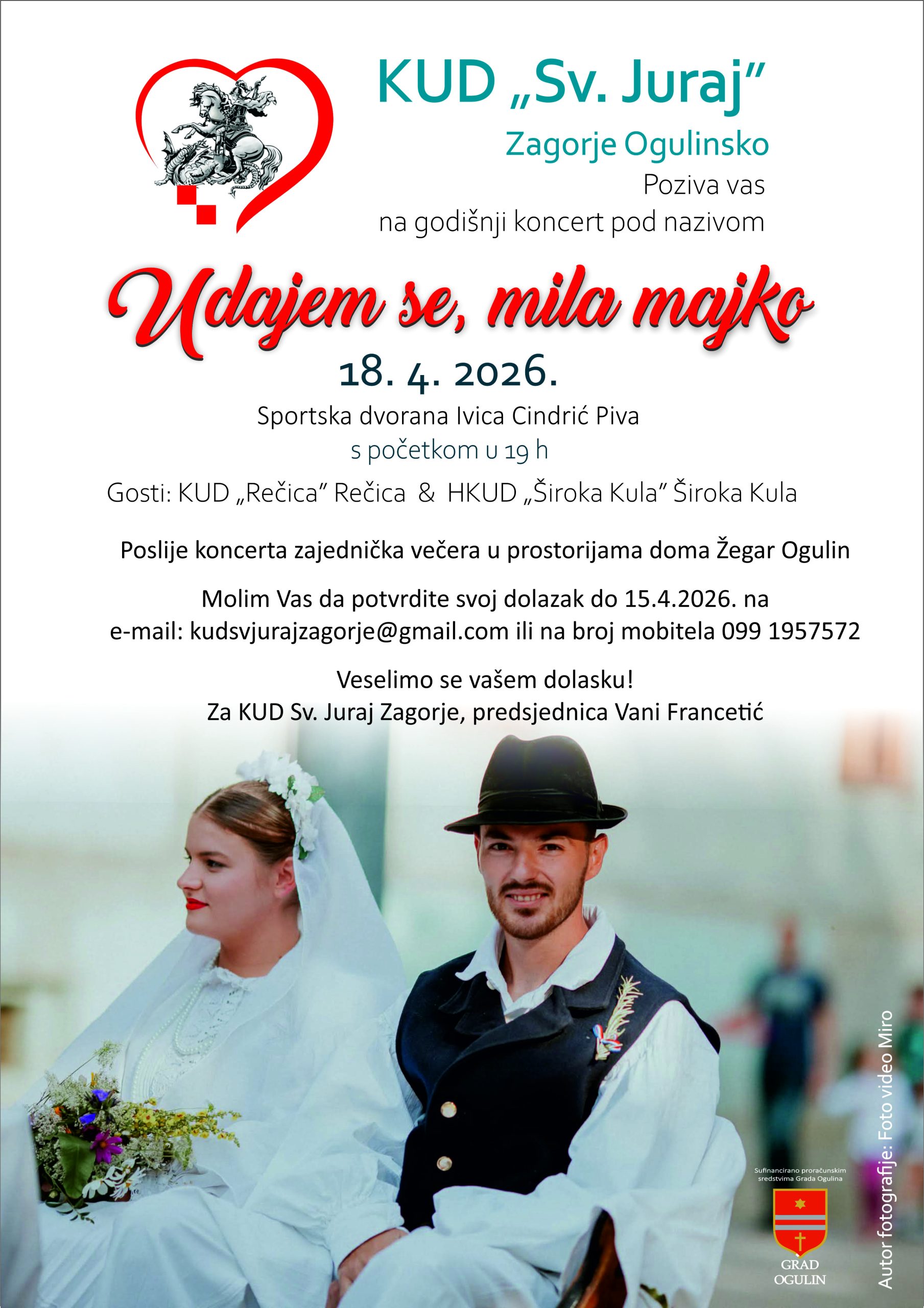 KUD “Sveti Juraj” Zagorje Ogulinsko organizira godišnji koncert pod nazivom “Udajem se, mila majko” koji će se održati 18. travnja 2026. godine u sportskoj dvorani Ivica Cindrić Piva s početkom u 19 sati. Uz domaćina na koncertu će nastupiti gosti KUD Rečica iz Rečice i KUD Široka Kula iz istoimenog mjesta u Ličko-senjsko županiji.
