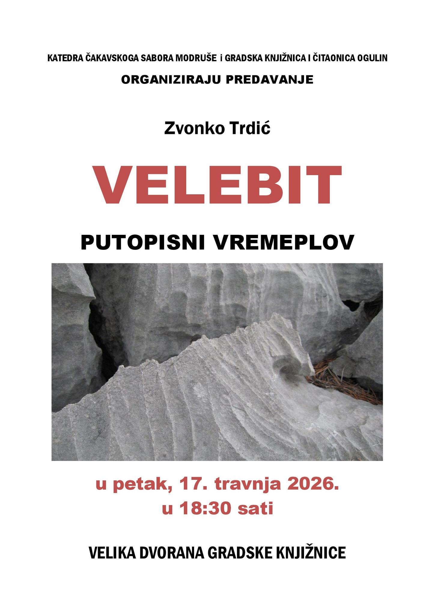 U organizaciji Katedre čakavskog sabora Modruše i Gradske knjižnice i čitaonice Ogulin u petak 17. travnja organizira se predavanje o Velebitu. Predsjednik Katedre i višegodišnji planinar Zvonko Trdić će kroz tri tematske cjeline progovoriti o planinama, planinarima i stanovnicima Velebita. To će uz živu riječ potkrijepiti fotografijama.